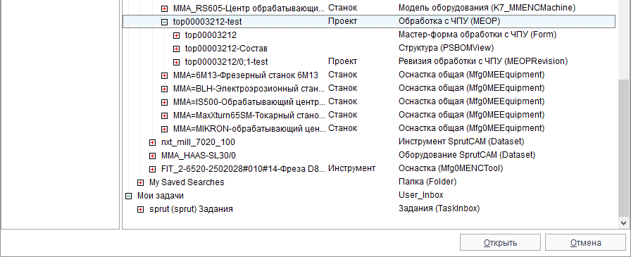 Откроется окно с деревом объектов PLM-системы (подробнее Окно дерева объектов PLM-системы), выберите загружаемую обработку с ЧПУ, подтвердите выбор нажатием кнопки “Открыть”.